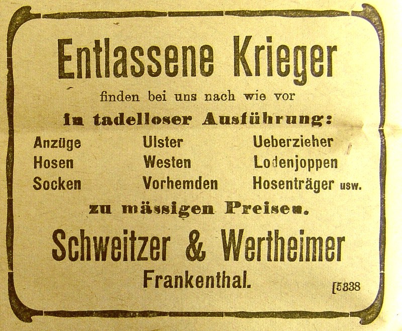 Am 18. Januar des Kriegsjahres 1918 wird in der Frankenthaler Zeitung ein Nachmieter, für eines der untervermieteten Ladengeschäfte, gesucht.