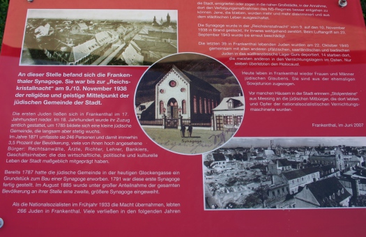 Im Stadtarchiv Frankenthal geben zahlreiche Dokumente Informationen über die Geschichte der Juden von der Ansiedlung der ersten Familien ab 1750 bis zur Deportation der Menschen am 22. Oktober 1940 in das Internierungslager Gurs in Südwestfrankreich. Besonders dramatisch sind die Unterlagen über die Enteignung („Arisierung“) der zahlreichen jüdischen Geschäfte und Anwaltsbüros.