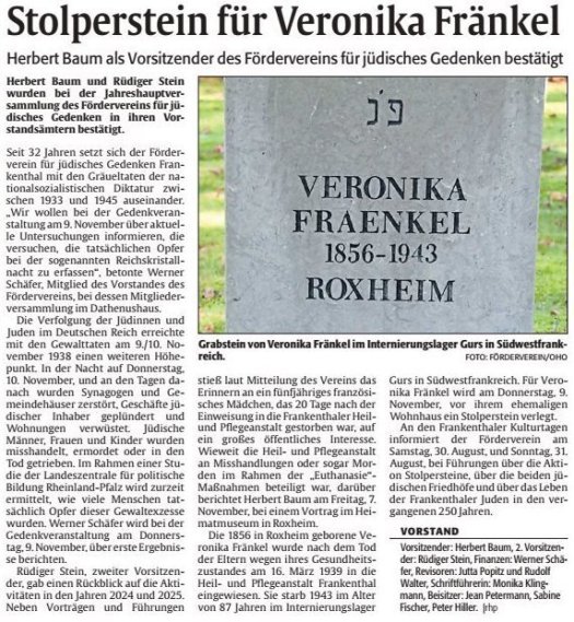 Die 1856 in Roxheim geborene Veronika Fränkel wurde nach dem Tod der Eltern wegen ihres Gesundheitszustandes am 16. März 1939 in die Heil- und Pflegeanstalt Frankenthal eingewiesen. Sie starb 1943 im Alter von 87 Jahren im Internierungslager Gurs in Südwestfrankreich. Für Veronika Fränkel wird am Sonntag, 9. November, vor ihrem ehemaligen Wohnhaus ein Stolperstein verlegt.
